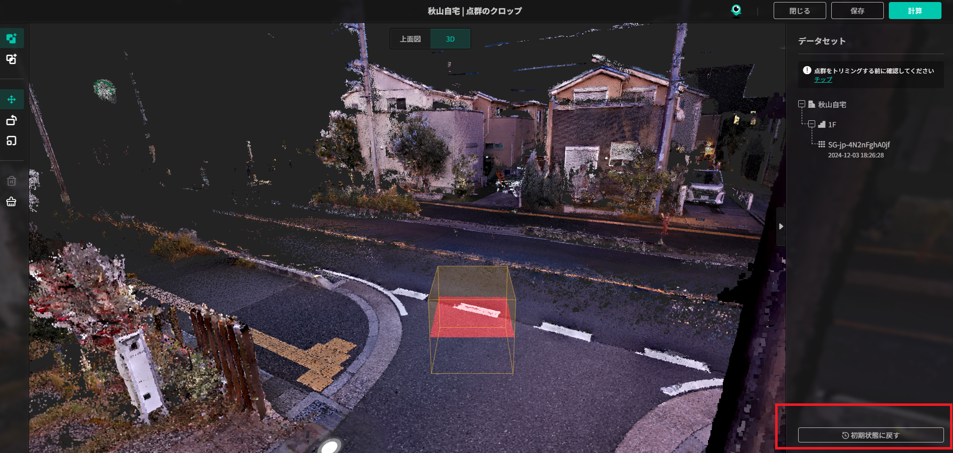 点群のクロップ画面で、『初期状態に戻す』をクリックします。