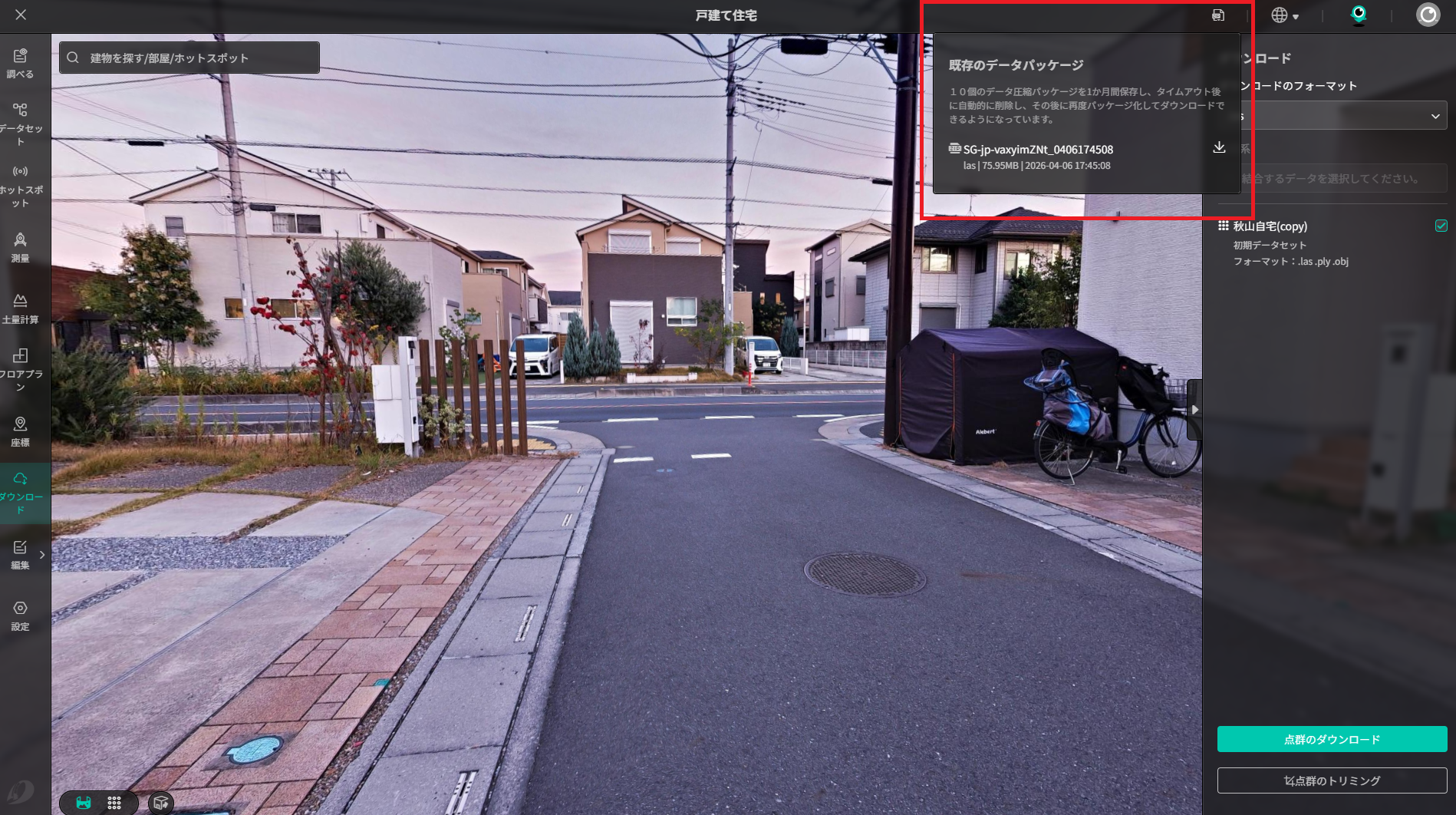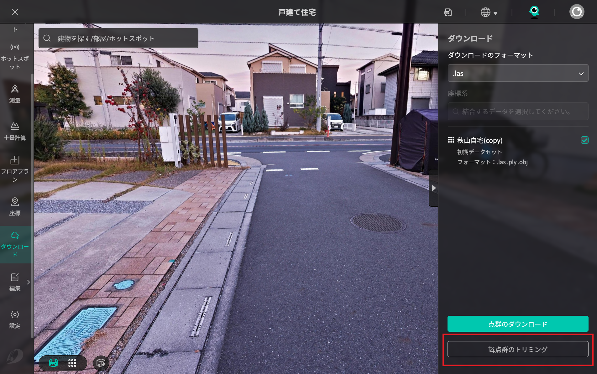 ノイズ除去が完了したら、必要な範囲の点群をLAS形式でダウンロードします。