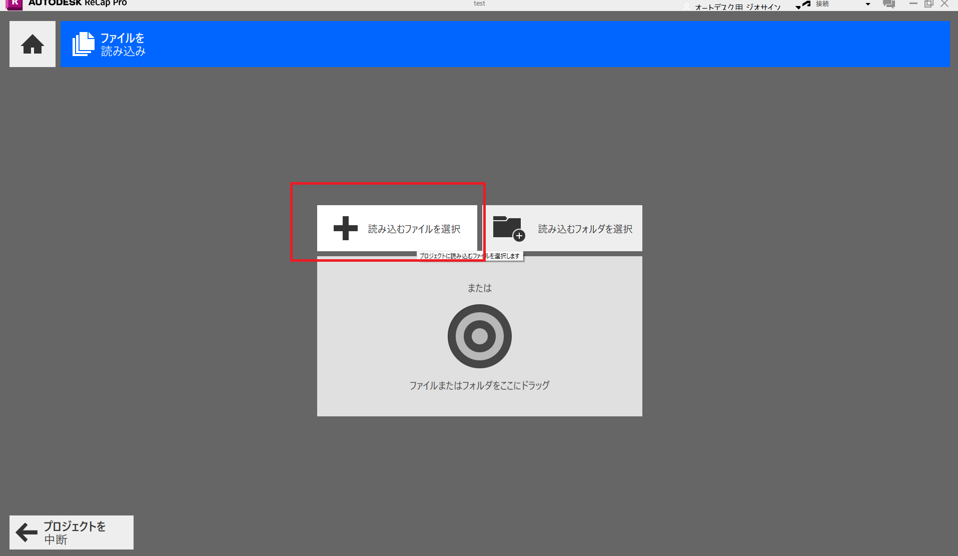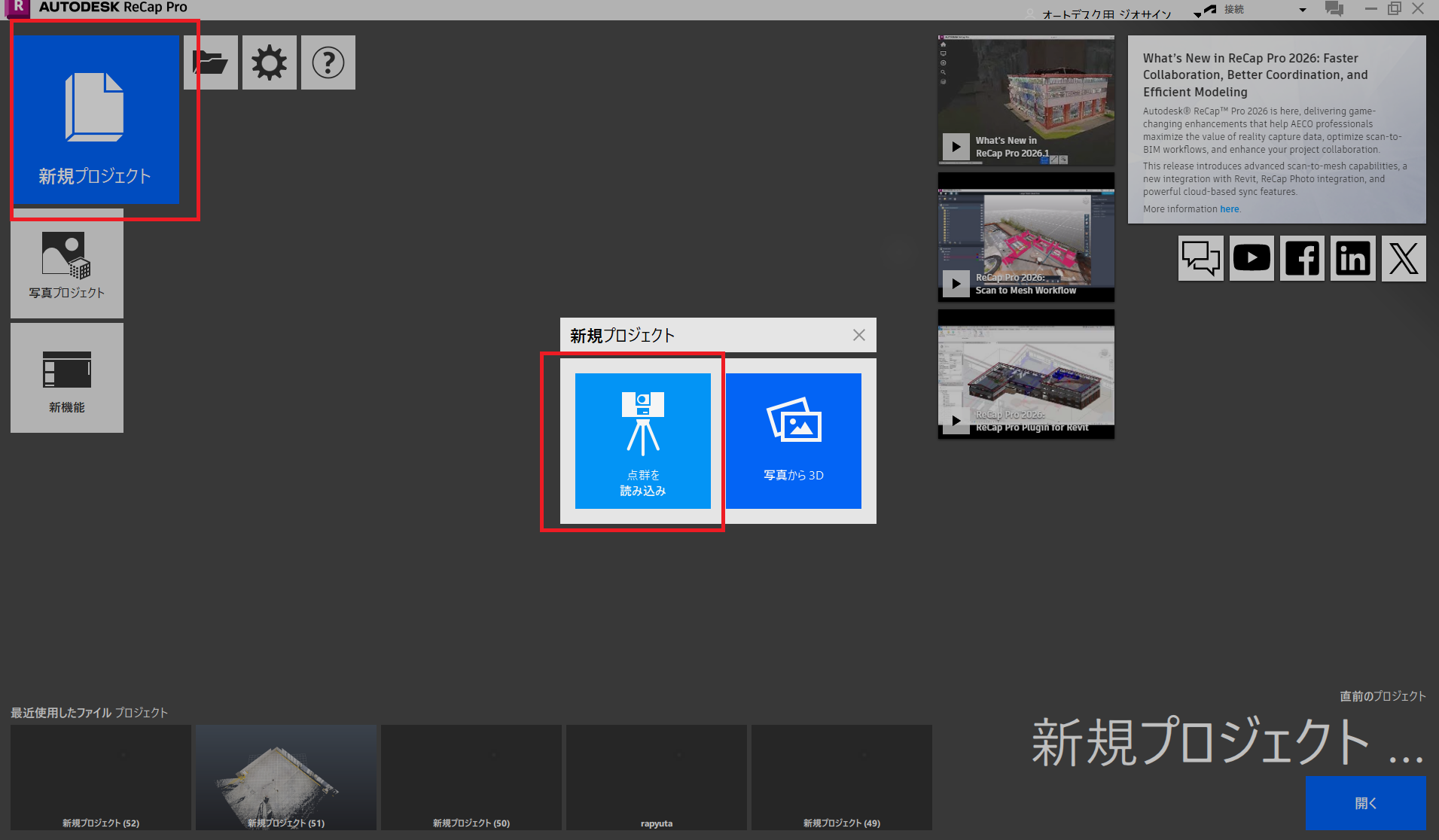 起動画面の 「新規プロジェクト」 をクリックします。 「点群を読み込み」 をクリックします。