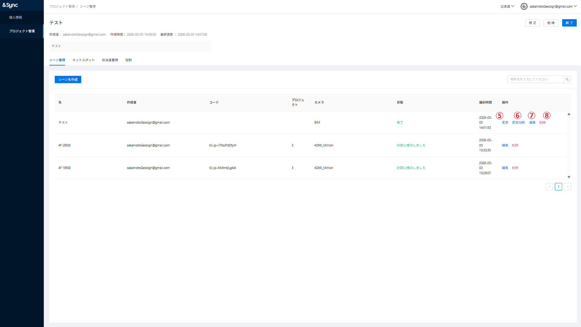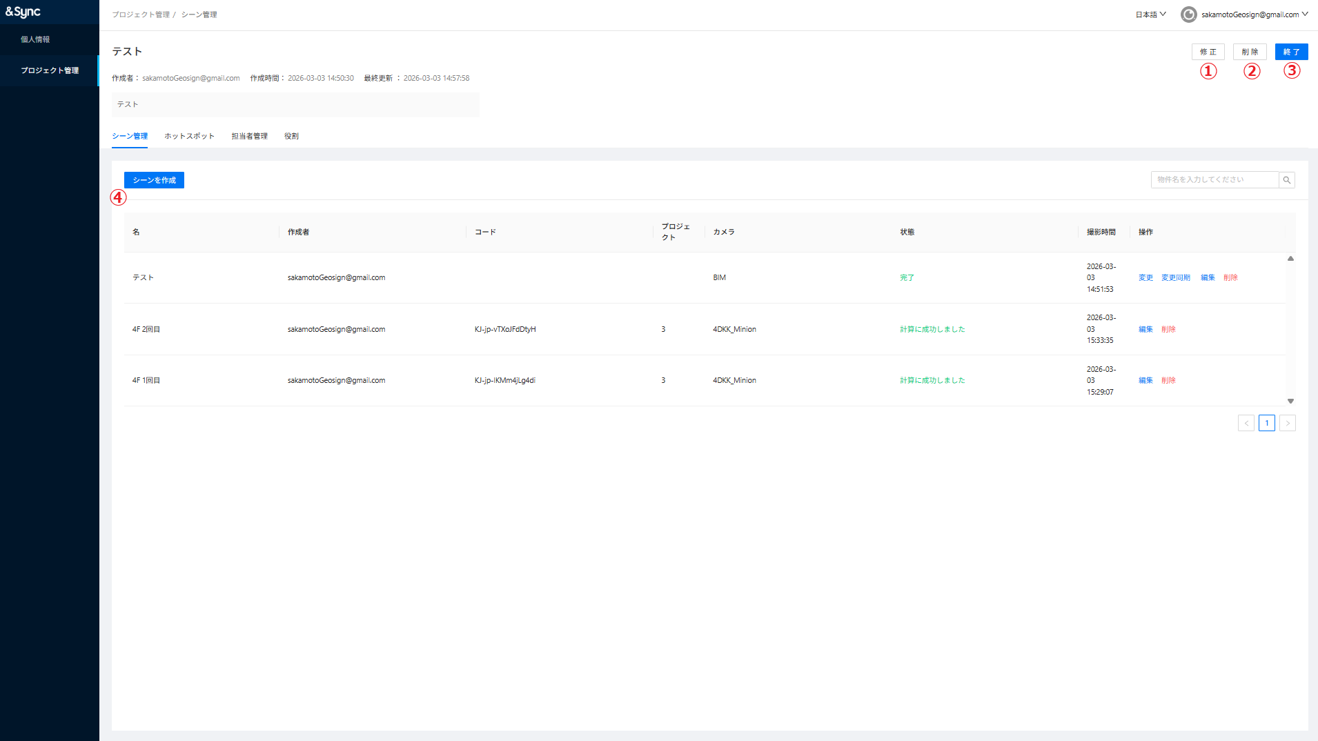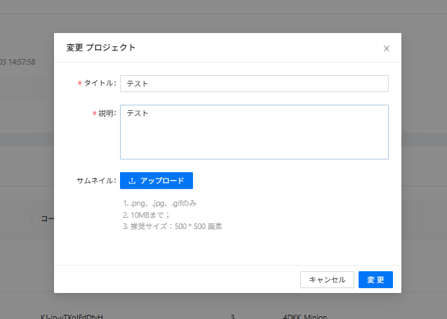 ①修正:プロジェクトのタイトル、説明文の変更、サムネイルの変更ができます。