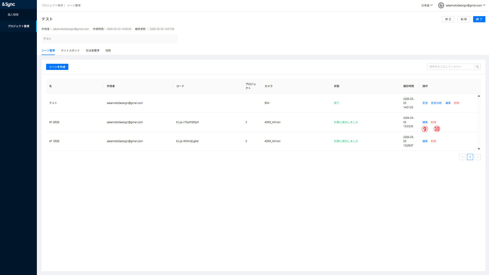 ⑨編集:閲覧画面に遷移します。⑩削除:紐づけたシーンを削除します。