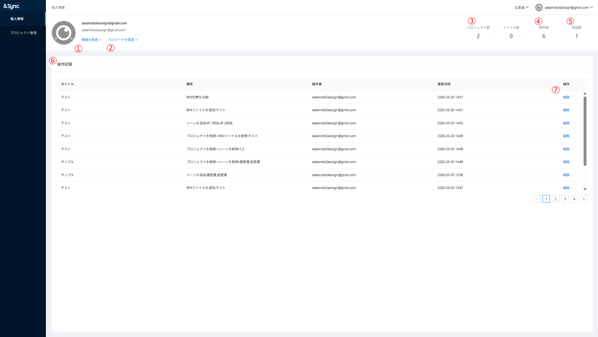 ③プロジェクト数:アカウントに紐づくプロジェクト数が表示されます。