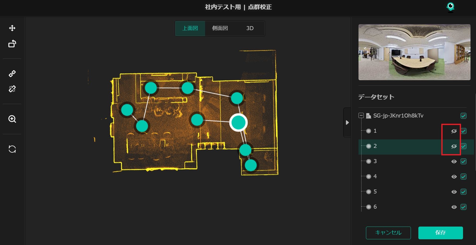 非表示にしたいポイントの目のアイコンをクリックして、非表示にします。 再計算をすると、対象のポイントの画像や点群は非表示になります。