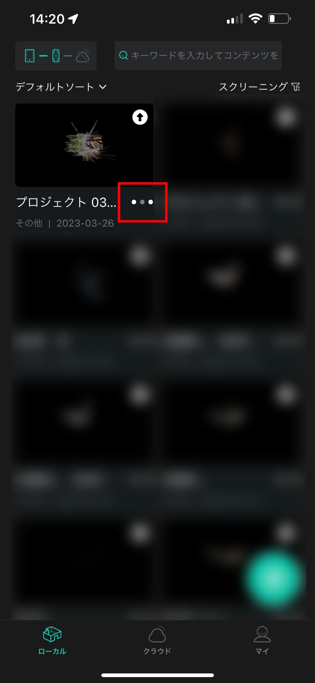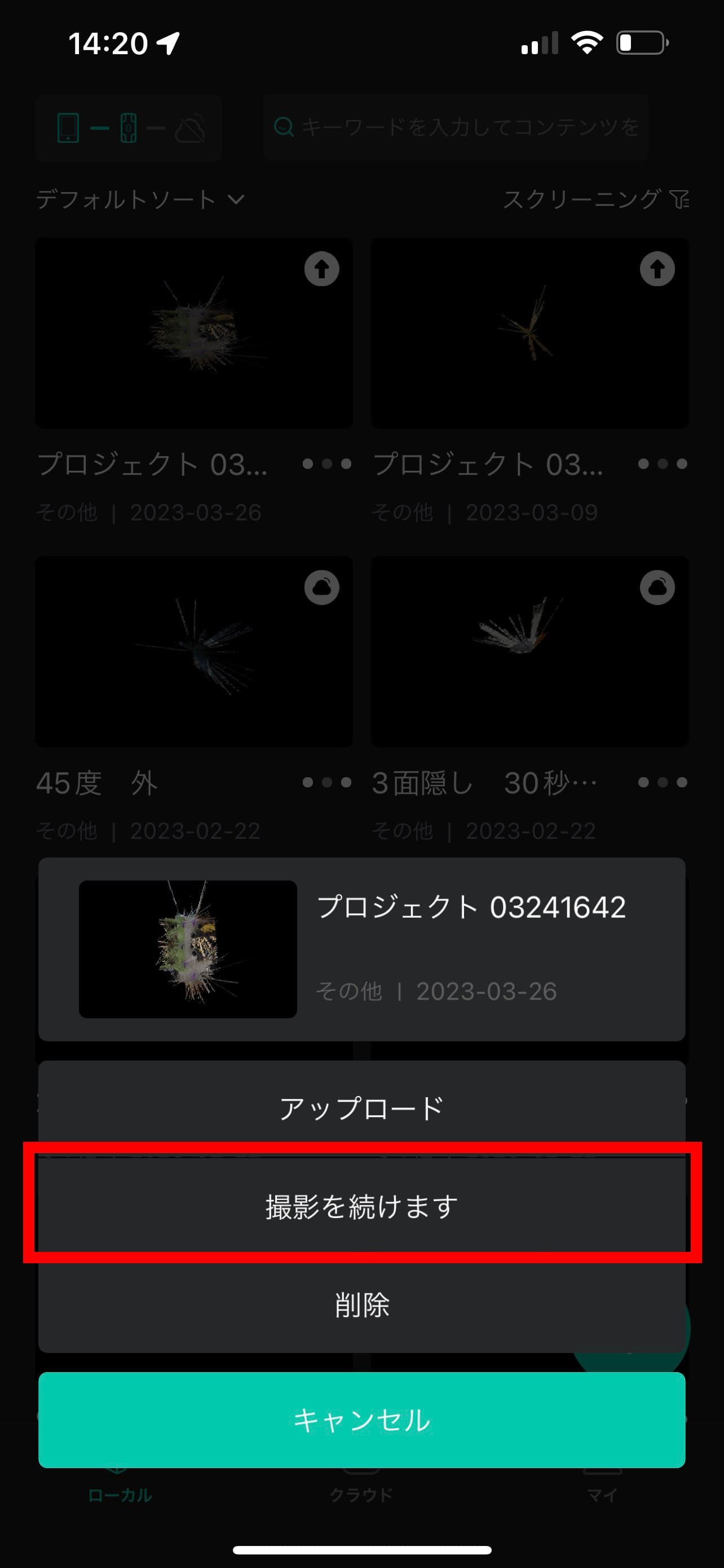 1度保存したデータの続きから撮影をする場合は、「‥」→「撮影を続ける」をタップします。