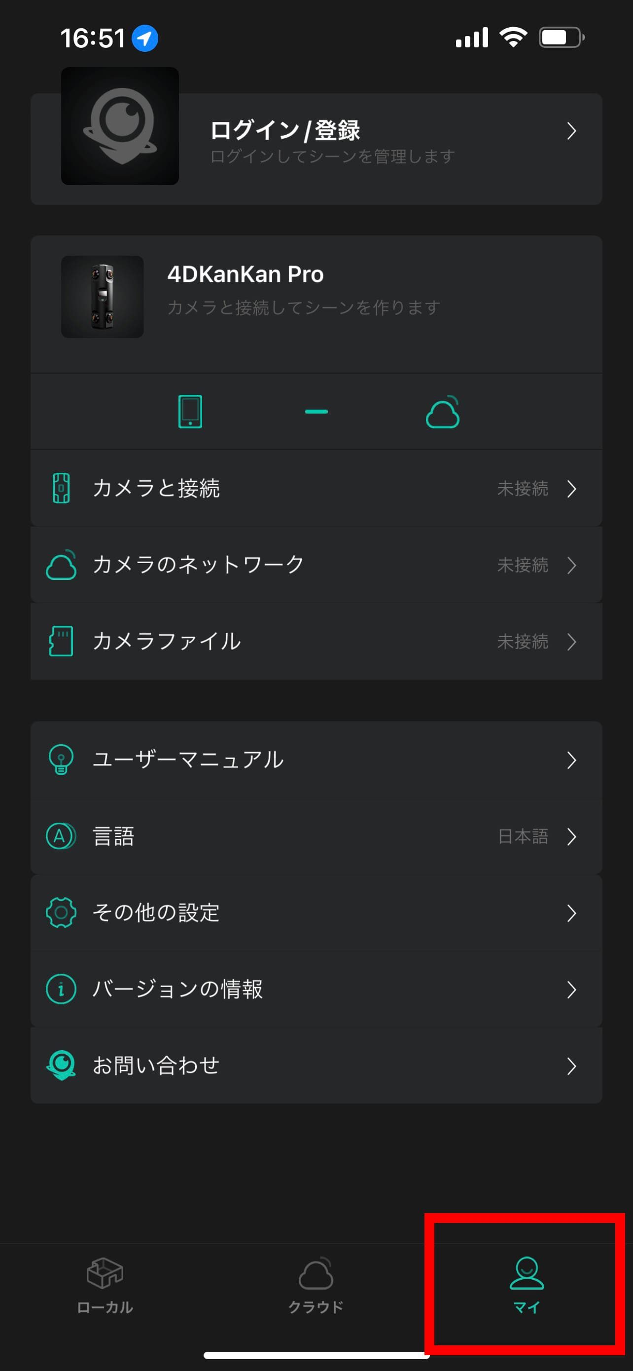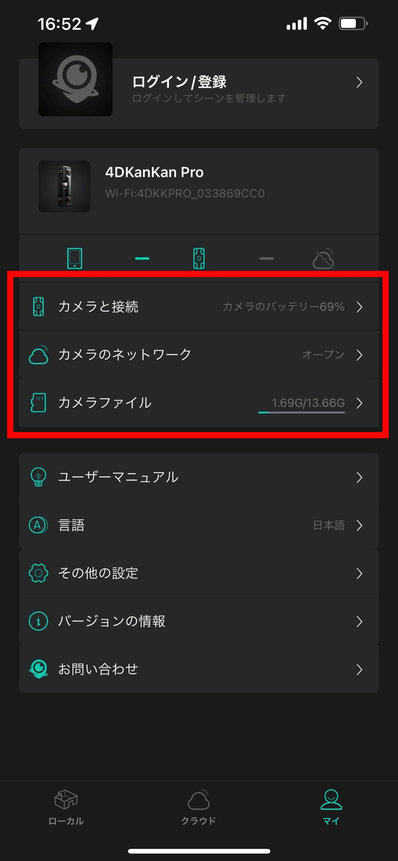 カメラが正常に接続されると、「マイページ」からカメラのバッテリーやストレージが確認できます。
