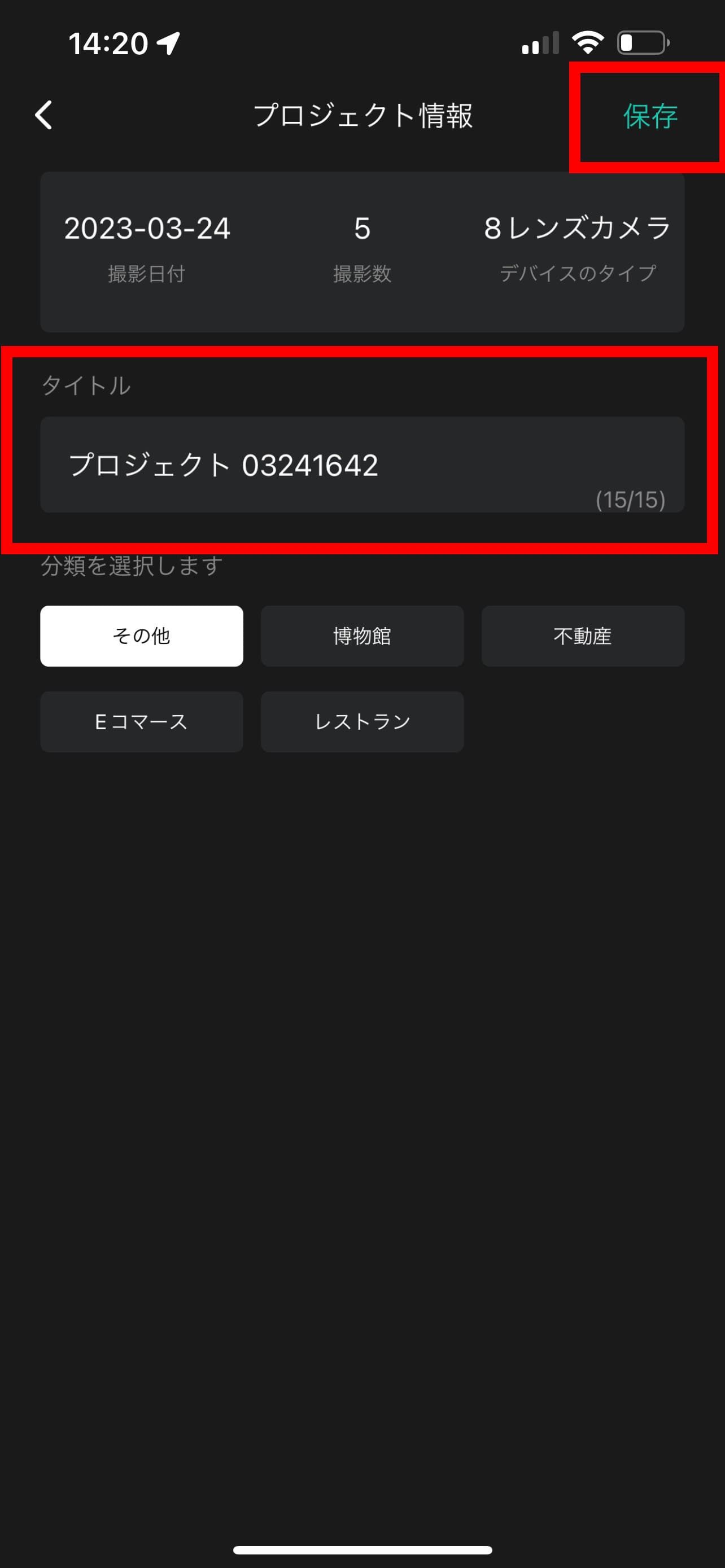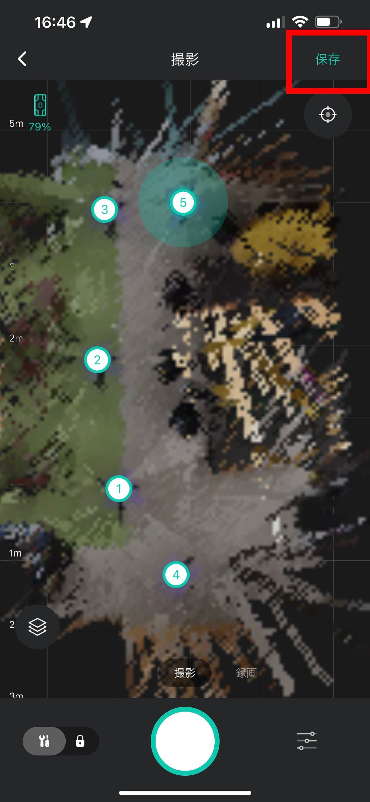 撮影が終了したら、撮影画面右上の「保存」をタップします。