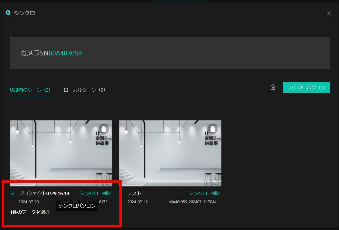 アップロードしたいデータに✓を入れ、シンクロをクリックします。