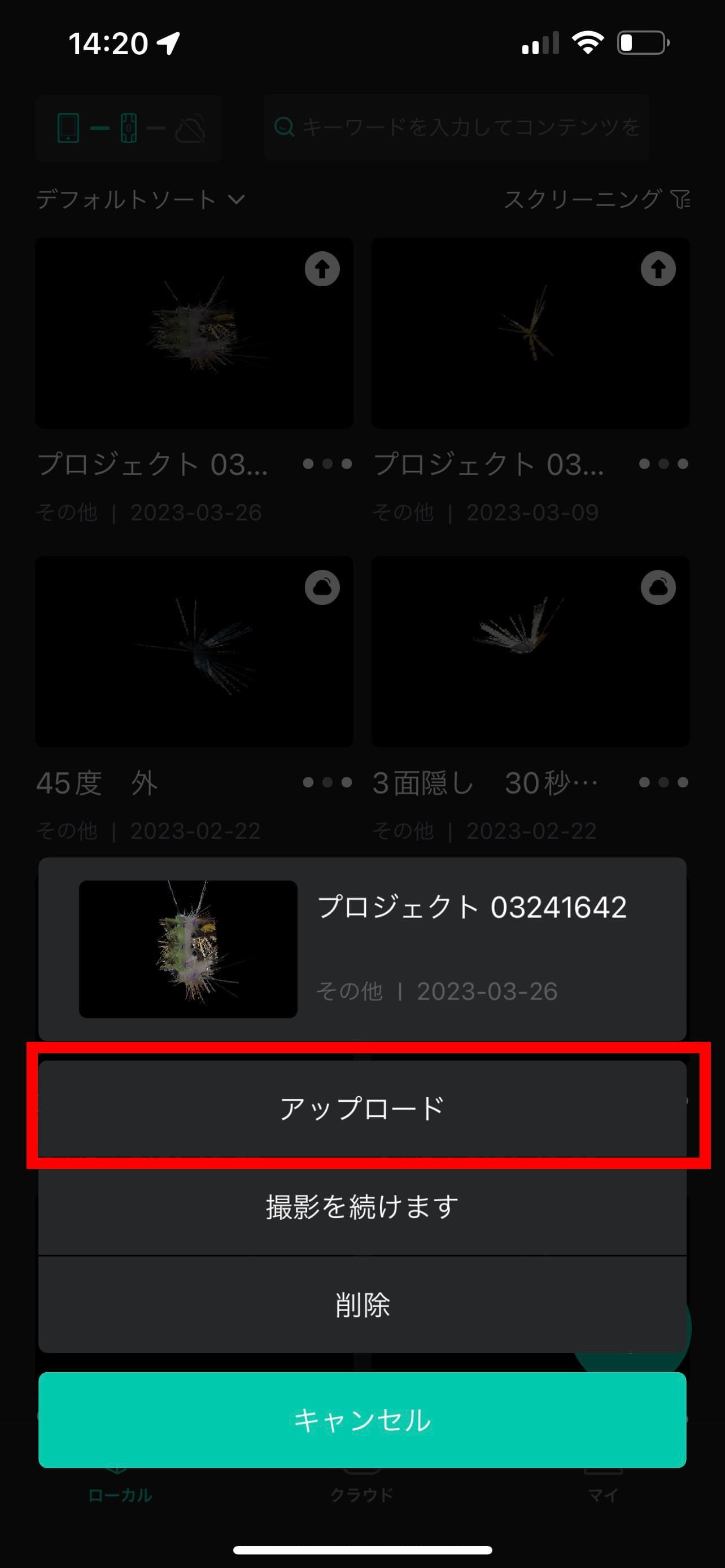 サムネイルの「↑」を押すか、「‥」→「アップロード」を押し、撮影データをUSBにアップロードします。