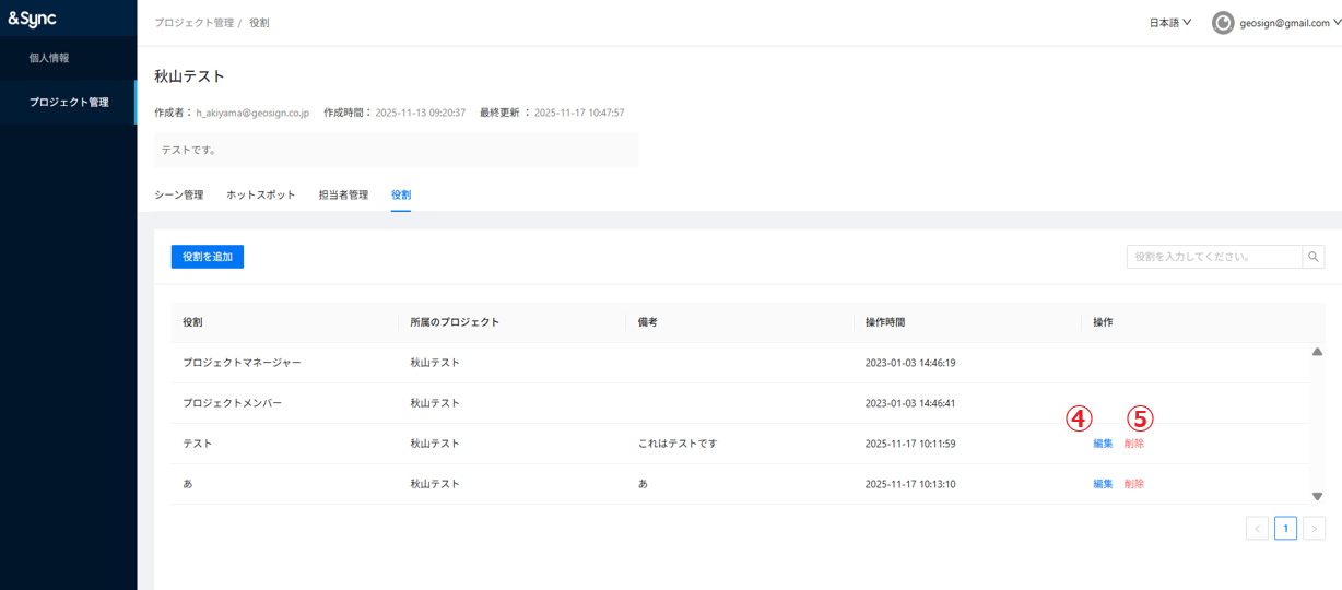 ⑤削除:役割を削除できます。