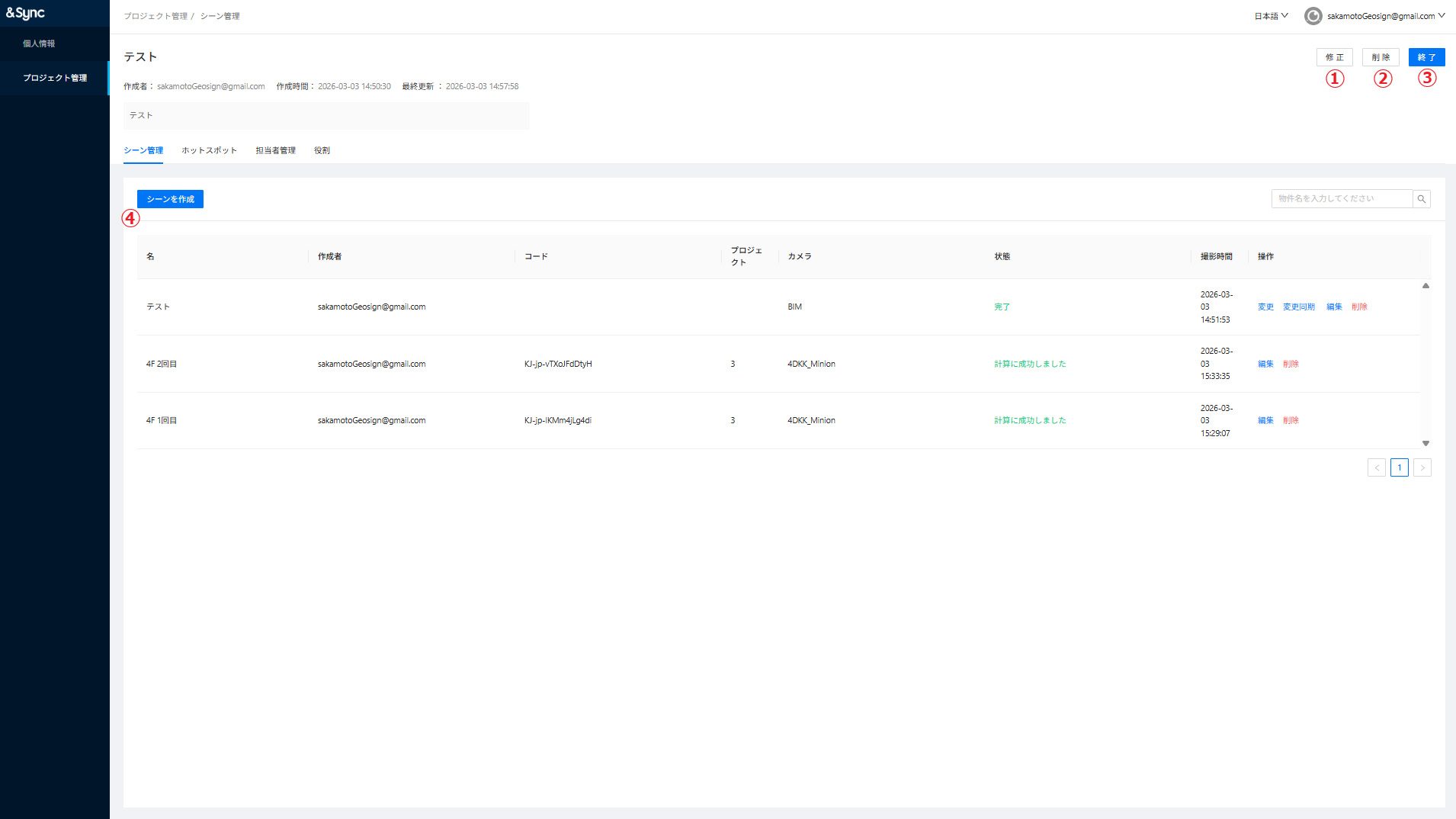 ①修正:プロジェクトのタイトル、説明文の変更、サムネイルの変更ができます。