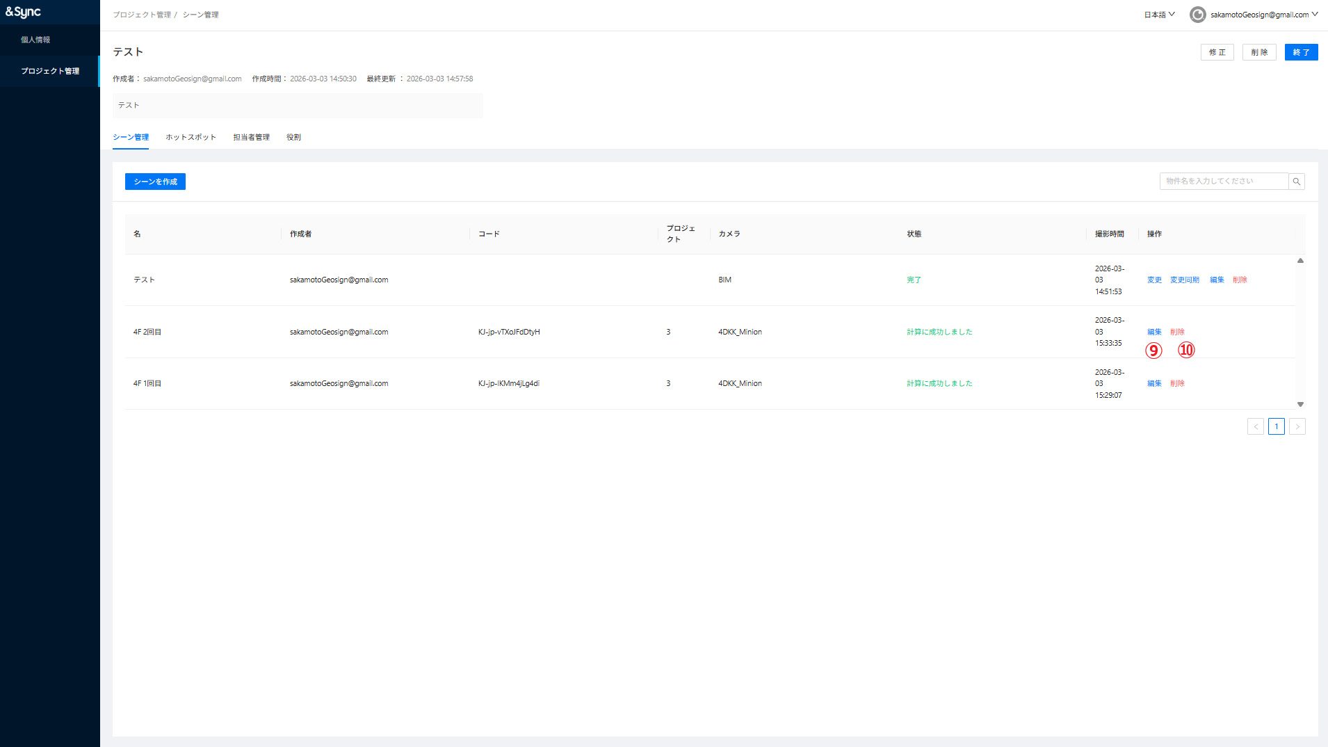⑨編集:閲覧画面に遷移します。⑩削除:紐づけたシーンを削除します。