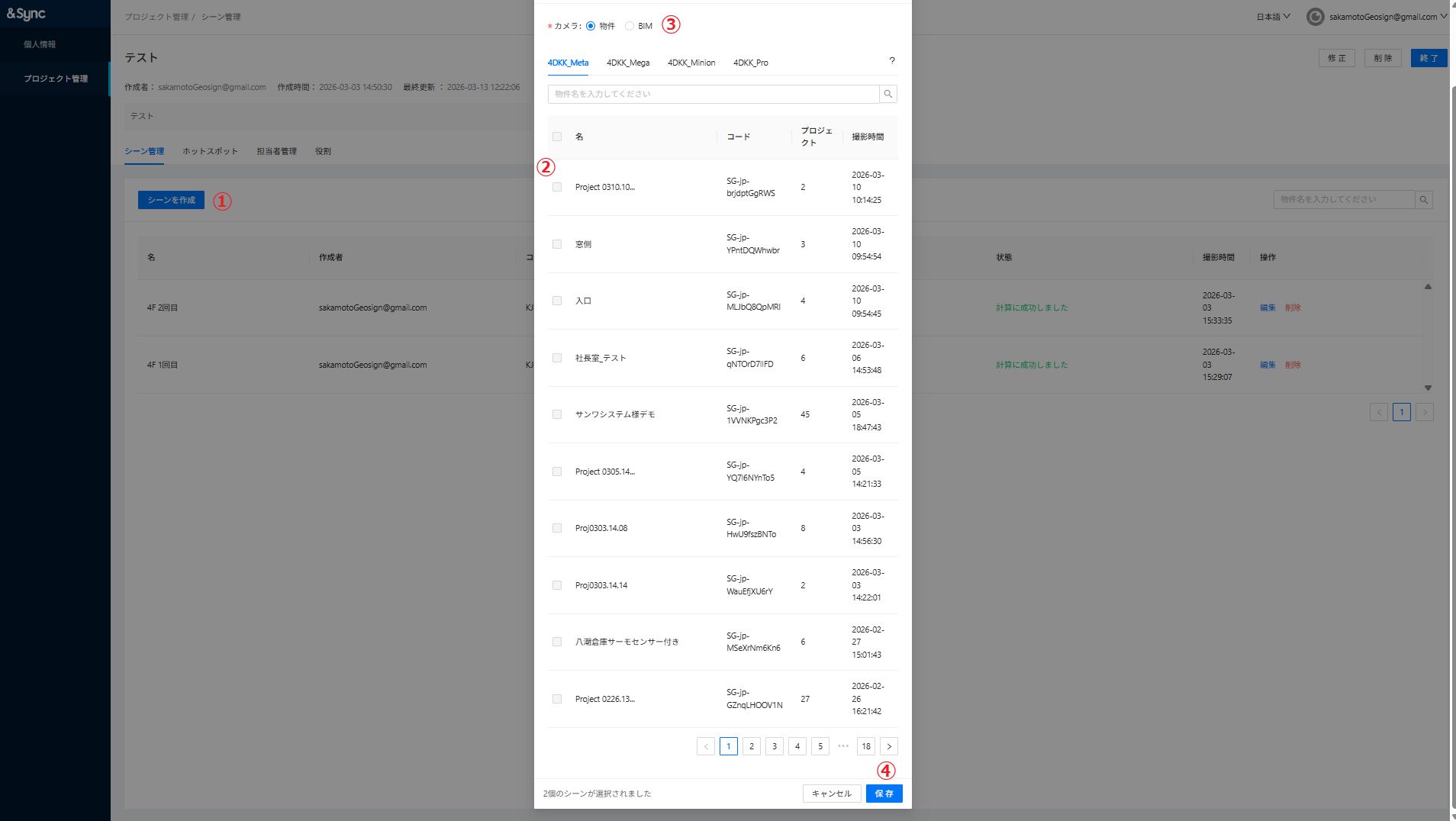 ②4DKanKan Cloudで管理されている撮影データが表示されます。&Syncに紐づけたいシーンにチェックを入れます。